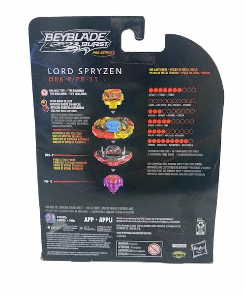 Compete with the elite in the Beyblade Burst Pro Series battle system, featuring authentic Japanese components and premium deco. Includes 1 Beyblade Burst Pro Series left-spin launcher and 1 right/left-spin competitive battling top: Lord Spryzen D88-P PR-11. Top includes die-cast metal parts for a heavy weight and battle performance features for intense competitions. Lord Spryzen balance type top features right and left adjustable spin direction in the Energy Layer and fused attack power in the Forge Disc. (Right-spin launcher sold separately.) Top also includes a GT Chip component.