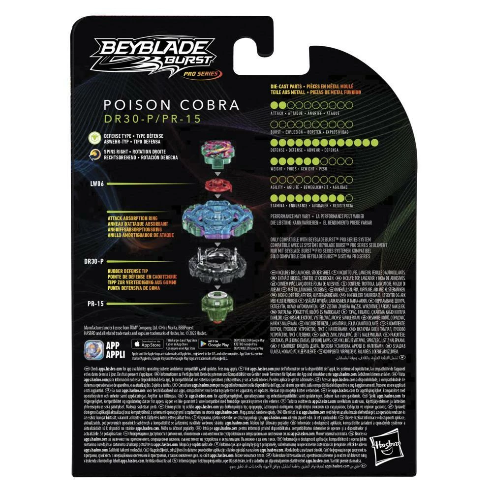 Compete with the elite using the authentic Japanese-inspired Beyblade Burst Pro Series battle system! Beyblade Burst Pro Series tops, launchers, and Evo Elite Champions Beystadium offer authentic components and battle performance features. This Starter Pack includes 1 Beyblade Burst Pro Series right-spin launcher, sticker sheet, and 1 right-spin competitive battling top: Poison Cobra DR30-P PR-15. Top includes die-cast metal parts for a heavy weight. Poison Cobra defense type top features a rubber attack absorption ring in the Energy Layer to absorb attacks and rubber Performance Tip Requires Beyblade Burst Pro Series Evo Elite Champions Beystadium (sold separately as part of the Evo Elite Champions Battle Set, subject to availability). Only compatible with Beyblade Burst Pro Series system. Official Beyblade Burst Pro Series Starter Pack by Hasbro makes a great gift for Beyblade Burst fans and collectors. Hasbro and all related terms are trademarks of Hasbro.