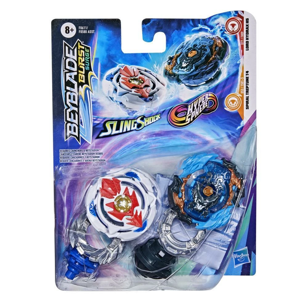Includes 2 Beyblade Burst competitive battling tops: Hypersphere Lord Hydrax H5 D77 TH09 (left-spin top) and Slingshock Spiral Treptune T4 D53 TS01-S (right-spin top.)