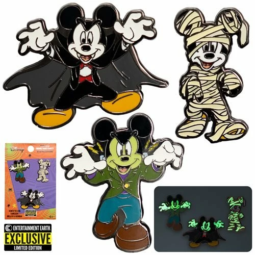 - Each set includes 3 pins – Mummy, Vampire, and Frankenstein Mickey.
